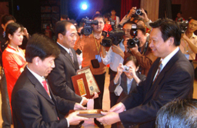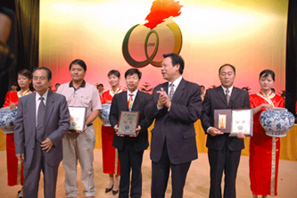 【概要描述】2005景德鎮(zhèn)國際陶瓷博覽會頒獎大會10月18日上午在財富大廈劇院隆重舉行。共有39家來自海內外的參展企業(yè)和單位的品牌獲獎,其中金獎3個、銀獎6個、銅獎10個、優(yōu)秀獎20個。???省委副書記、常務副省長、本屆瓷博會組委會主任吳新雄,中國輕工業(yè)聯合會副會長、中國陶瓷工業(yè)協(xié)會會長、本屆瓷博會組委會副主任楊自鵬出席頒獎儀式為獲得金獎得主頒獎.(中間領獎人為隆達公司副總張志全先生)??省委副書記、常務副省